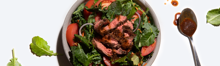 Add ½ pouch of Kevin's Korean BBQ Sauce to your same pan. Add ¼ cup apple cider vinegar to the pan, and bring it to a simmer. Add 1-2 TSP of Kevin's Steak Seasoning. Stir and remove from heat. -